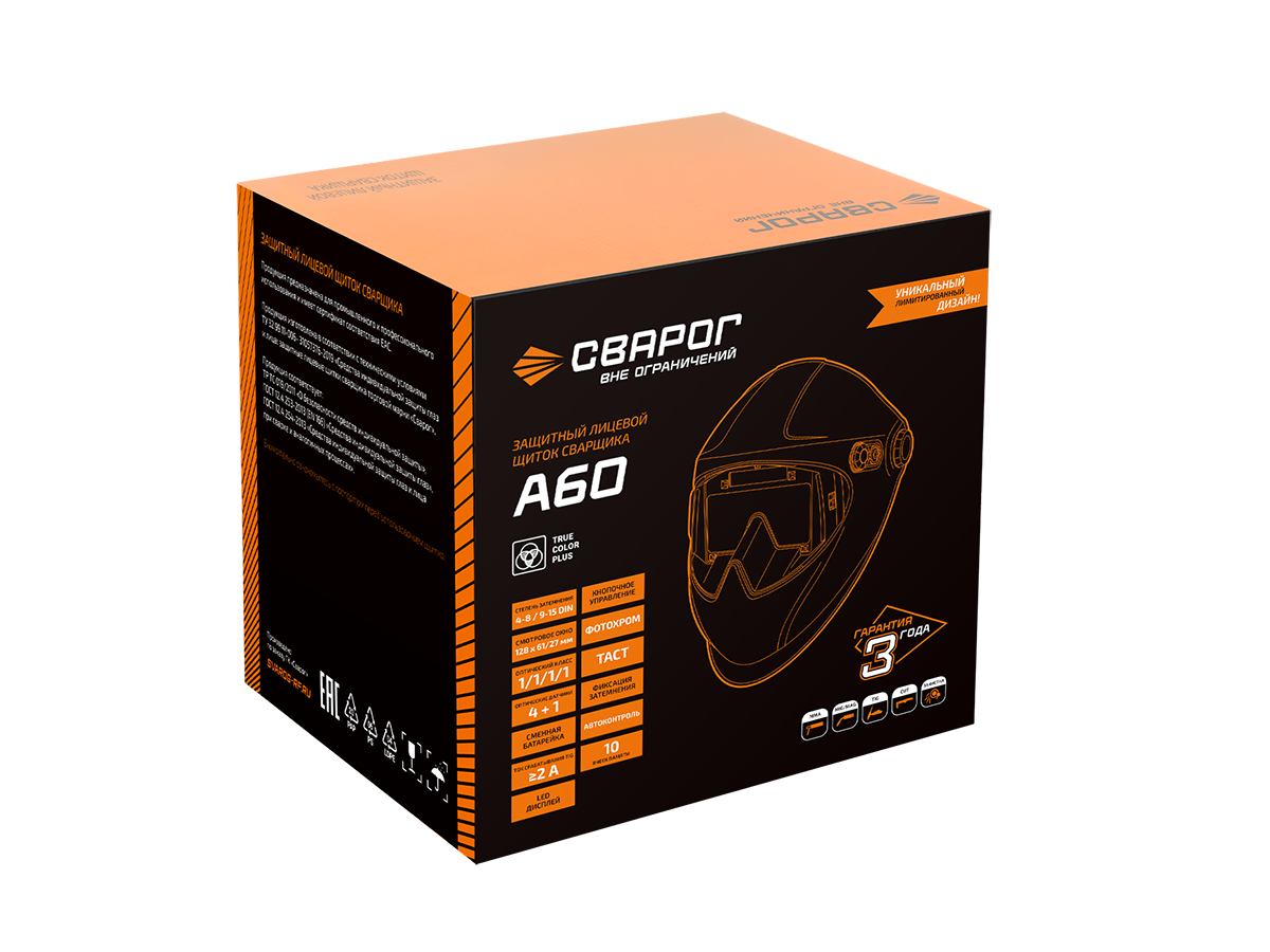 СВАРОЧНЫЙ ЩИТОК A60 СНЕЖНЫЙ БАРС — это маска с автоматическим светофильтром и расширенным функционалом для работы на высоких токах, в сложных условиях и при максимальных требованиях к комфорту и безопасности. Модель сочетает оптический класс 1/1/1/1, точные цифровые настройки, TRUE COLOR и затемнение до DIN 15 — всё, что необходимо для серьёзных задач профессионального сварщика.