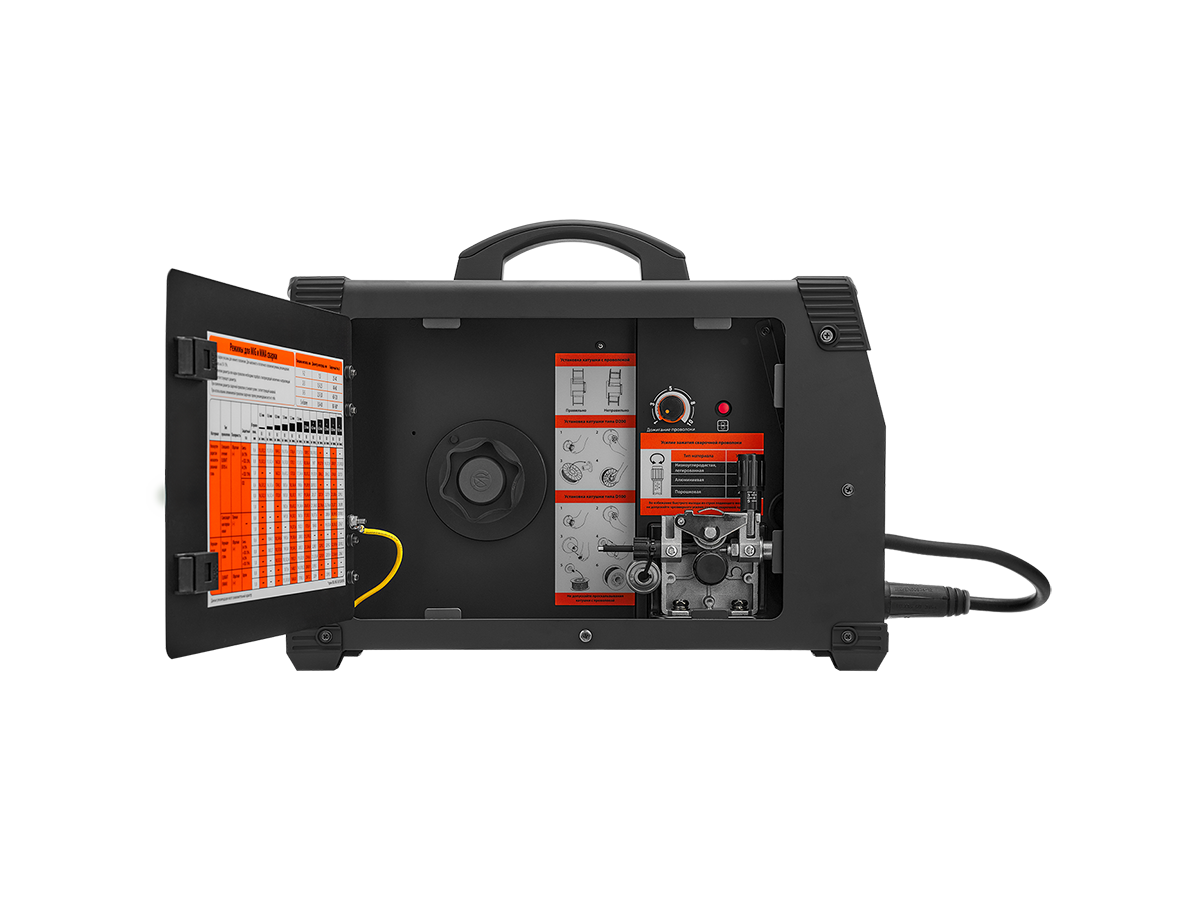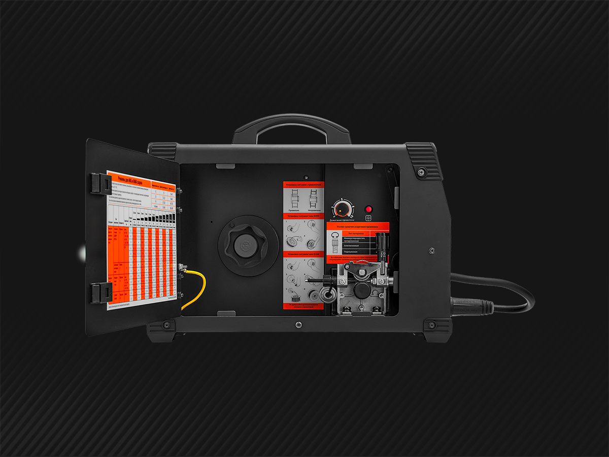 • На дверце бункера расположена таблица с настройками для MIG и MMA сварки. Также указана информация по установке катушки с проволокой и регулировки зажатия сварочной проволоки. Это особенно полезно для тех, кто только начинает осваивать сварку
