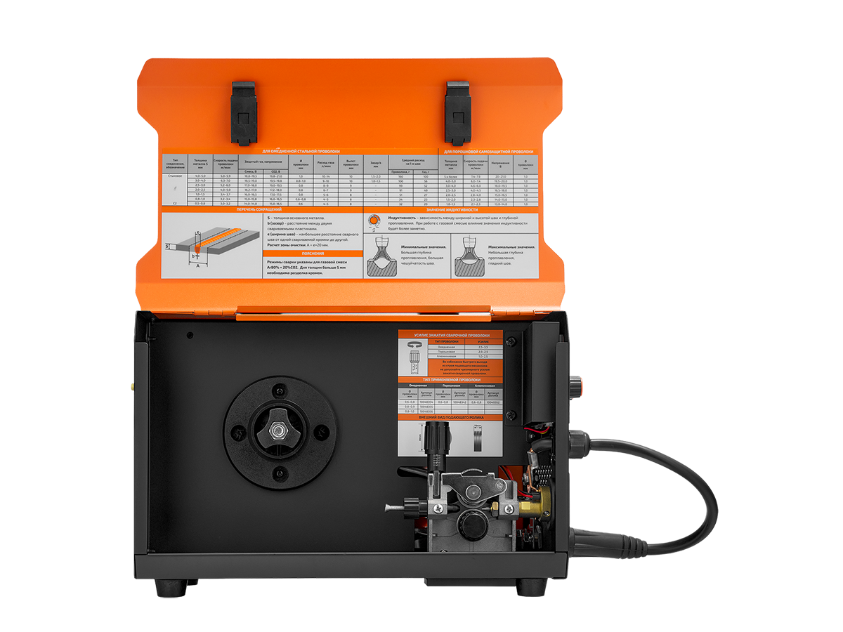 Максимальная защита аппарата от: перегрузки по току, превышения тока короткого замыкания, ограничения по мощности, перегрузки механизма подачи проволоки и перегрева силовой части.