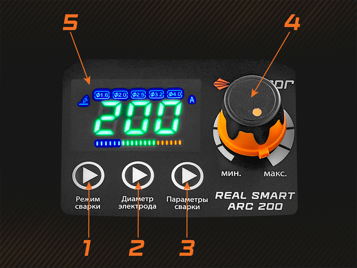 На лицевой панели расположен цветной дисплей (5), на котором отображаются все установленные параметры сварки. Настройка аппарата осуществляется с помощью регулятора (4) и кнопок переключения режима сварки (1), выбора диаметра электрода (2) и параметров сварки для ручного режима (3).