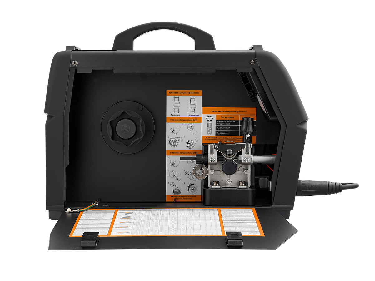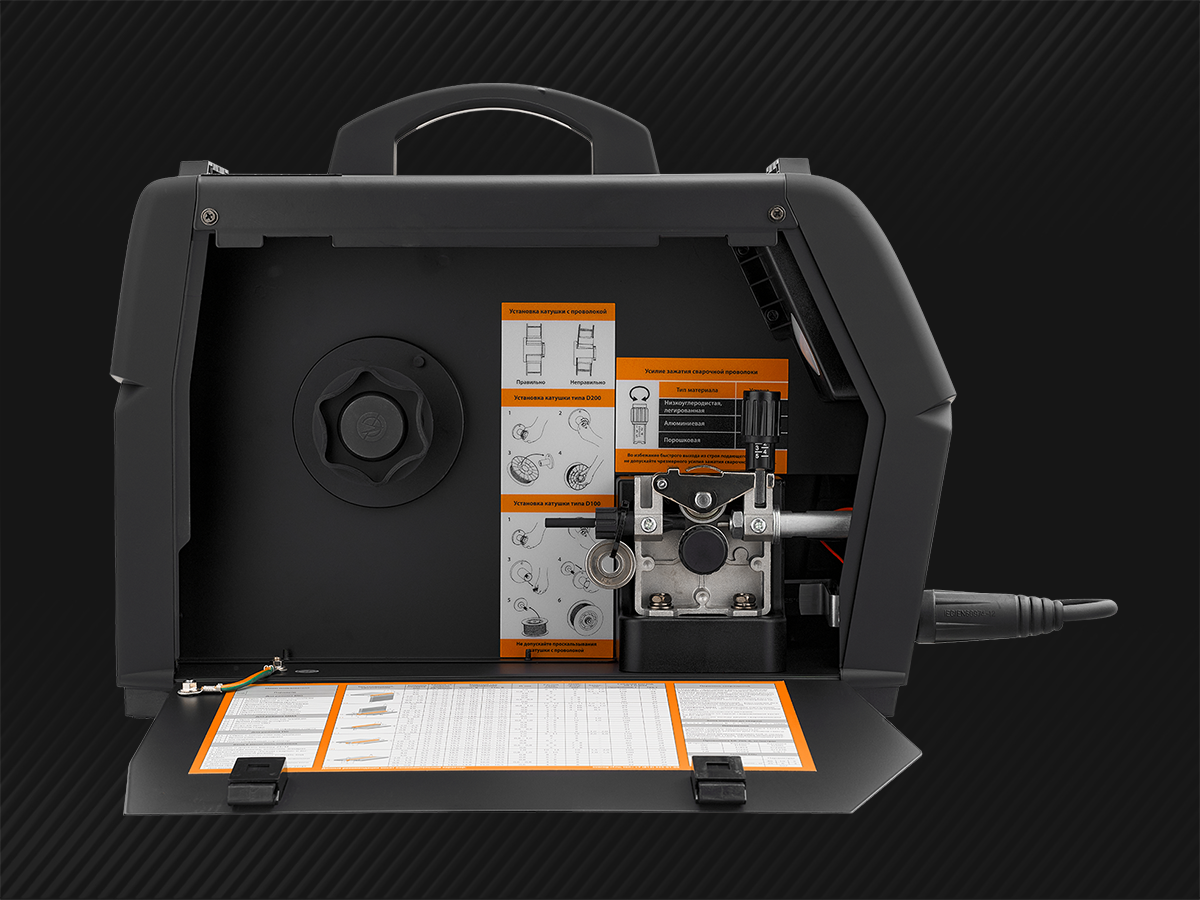 • На дверце бункера расположена таблица с настройками для MIG и MMA сварки. Также указана информация по установке катушки с проволокой и регулировки зажатия сварочной проволоки. Это особенно полезно для тех, кто только начинает осваивать сварку