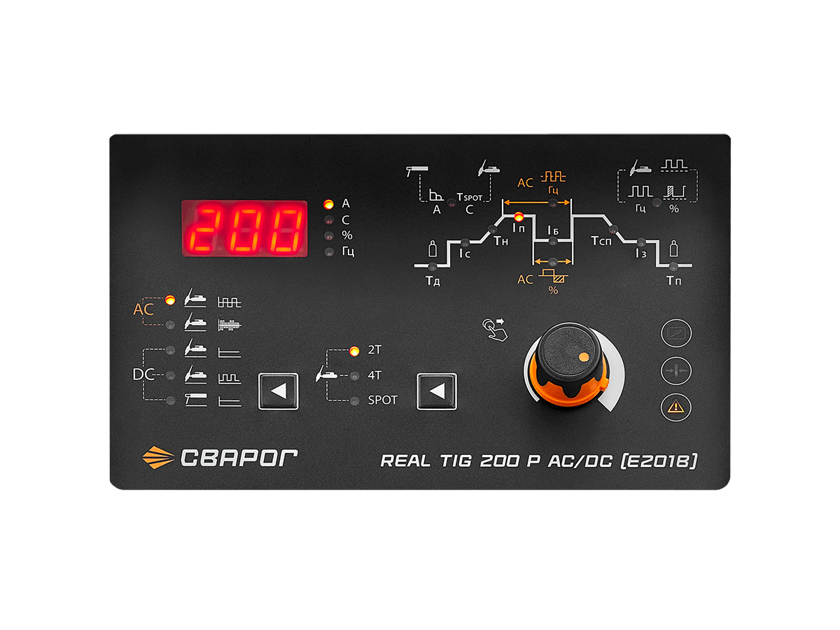 REAL TIG 200 P AC/DC BLACK (E201B) — инверторный сварочный аппарат с режимом аргонодуговой сварки (TIG) на постоянном (DC) и переменном токе (AC), ручной дуговой сварки (MMA) на постоянном (DC) токе.
